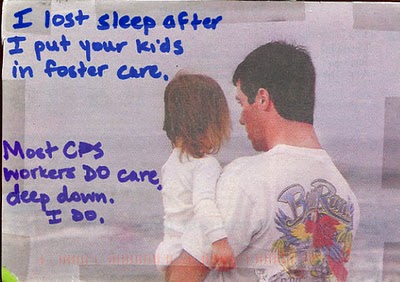 The first one, pictured above, spoke to me because I think that people outside the field believe that child protection workers enjoy taking kids away from their parents. While I am sure there are some punitive and cynical child protection workers – in fact I’ve met some and worked with some – I have never met a worker who finds pleasure in it. I have seen them express heartbreak over having to consider whether they need to remove a child from their parents. It is not an easy decision to make and I have to believe that if there comes a time when the worker does not agonize about whether the trauma of removing a child is worse than the trauma of leaving them there, then that is a sign that it’s time to put in for a transfer. It should never be a rote decision; even when using the “tools” of the trade – structured decision making forms and assessment checklists and the like – the decision to remove a child is often a mixture of art and science.