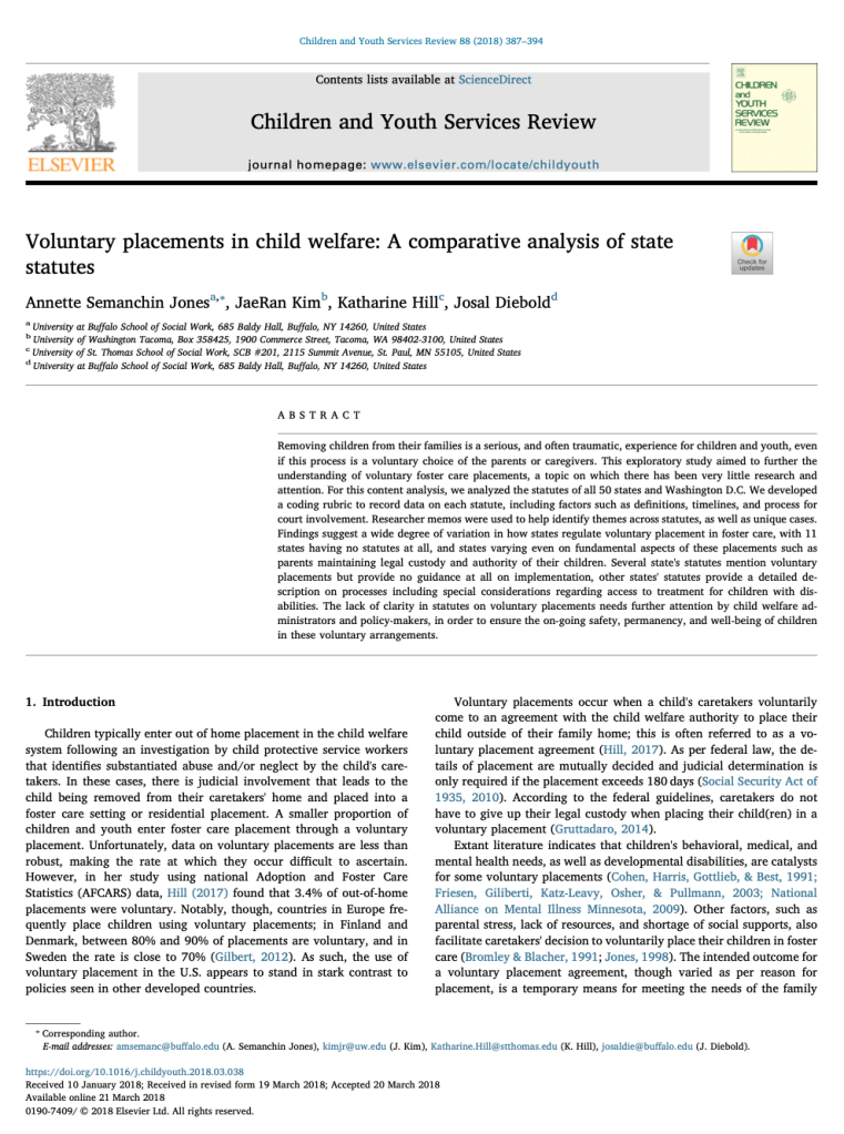 Semanchin Jones, A., Kim, J.R., Hill, K. & Diebel, J. (2018). Voluntary placements in child welfare: A comparative analysis of state statutes. Children and Youth Services Review, 88, 387-394