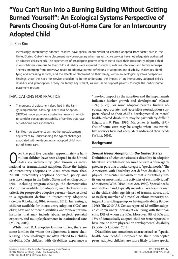 Kim, J.R. (2017). “You can’t run into a burning building without getting burned yourself”: An ecological systems perspective of parents choosing out-of-home care for an intercountry adopted child. Families in Society, 98(3), 169-177.