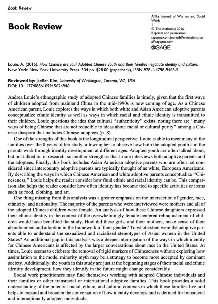 Kim, J.R. (2016). Book Review: How Chinese are you? Adopted Chinese youth and their families negotiate identity and culture. Affilia, 31(3), 390-390