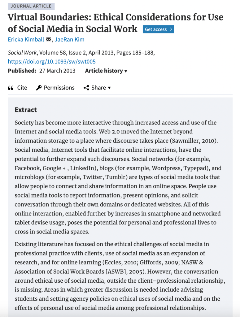 Kimball, E., & Kim, J. (2013). Virtual boundaries: Ethical considerations for use of social media in social work. Social Work, 58(2), 185-188.