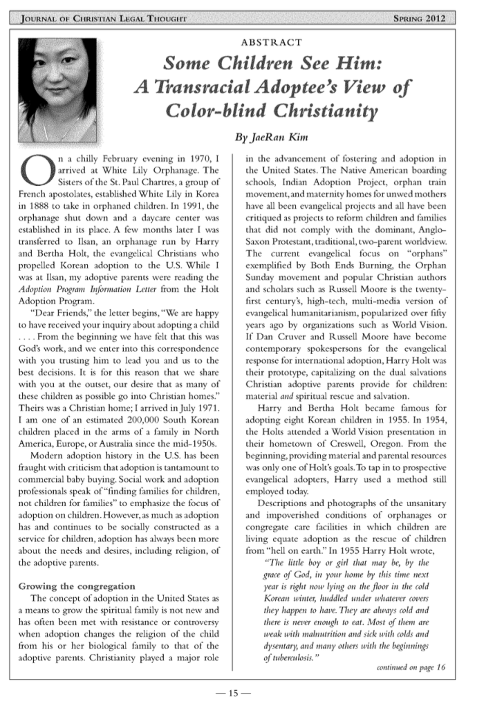 Kim, J.R. (2012). Some children see him: A transracial adoptee’s view of color-blind Christianity. Journal of Christian Legal Thought, 2(1).