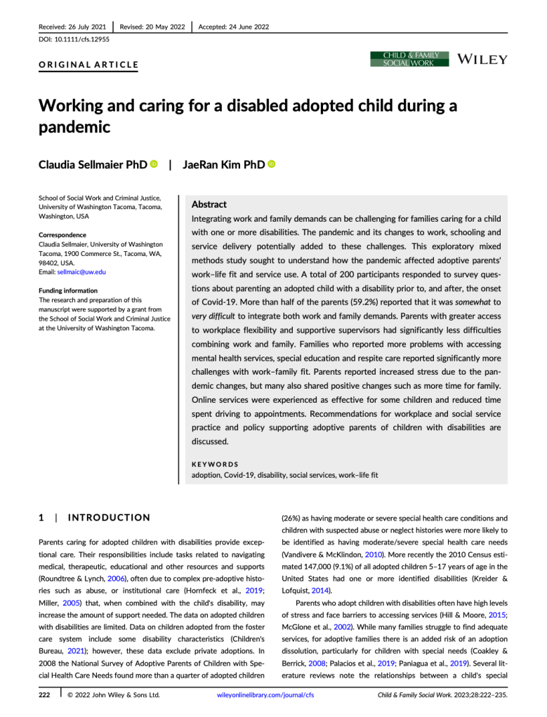 Sellmaier, C. & Kim, J. (2023). Working and caring for a disabled adopted child in times of COVID-19. Child and Family Social Work, 28(1), 222-235.