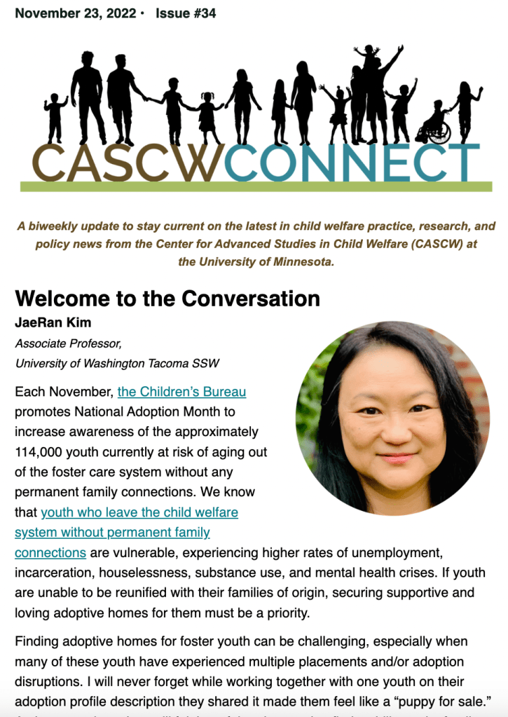 Kim, J. (2022). Welcome to the conversation. CASCW Connect, Issue #34. Center for Advanced Studies in Child Welfare, School of Social Work, University of Minnesota.