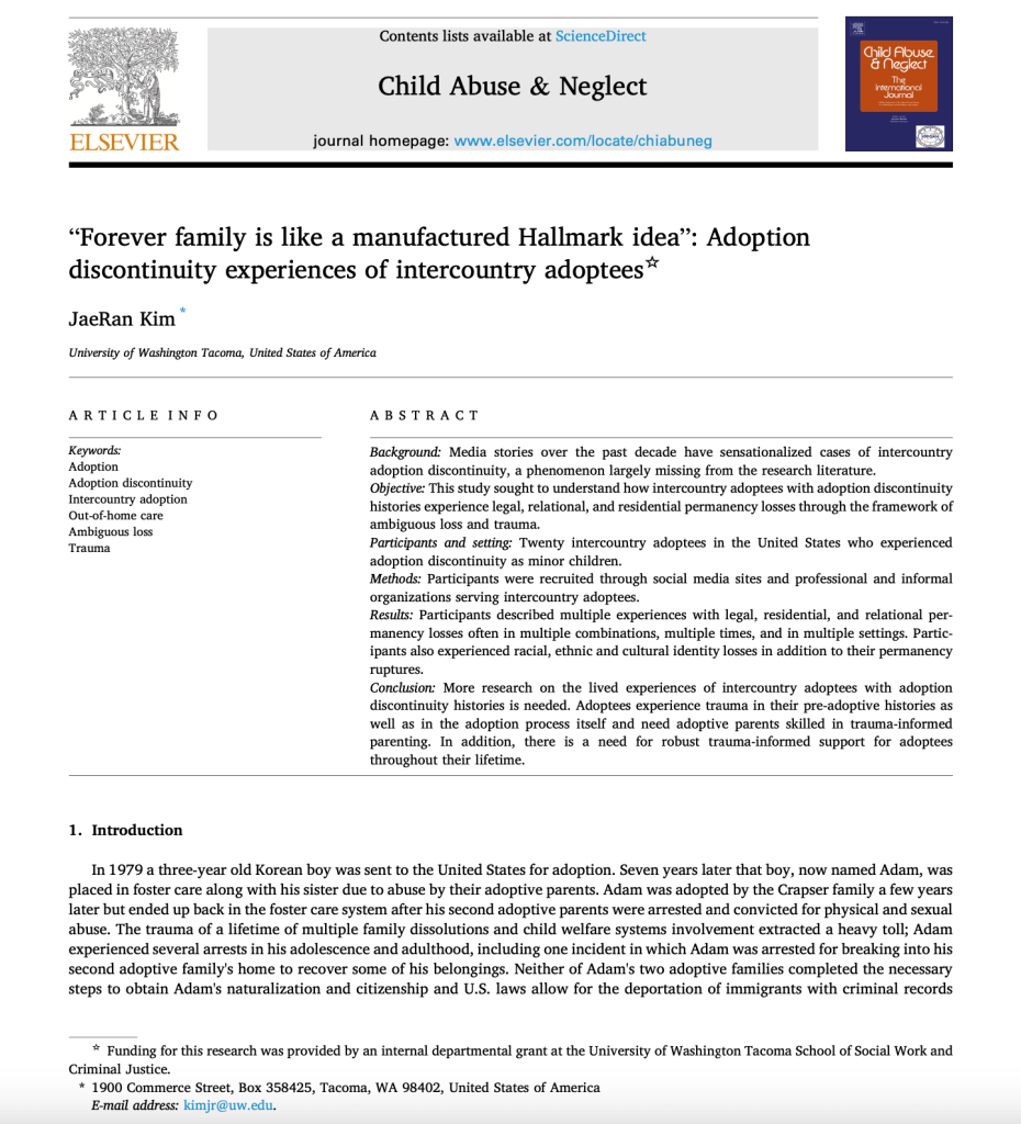 Kim, J. (2022). “Forever family is like a manufactured Hallmark idea”: Adoption discontinuity experiences of intercountry adoptees. Child Abuse & Neglect, 130, 105184.