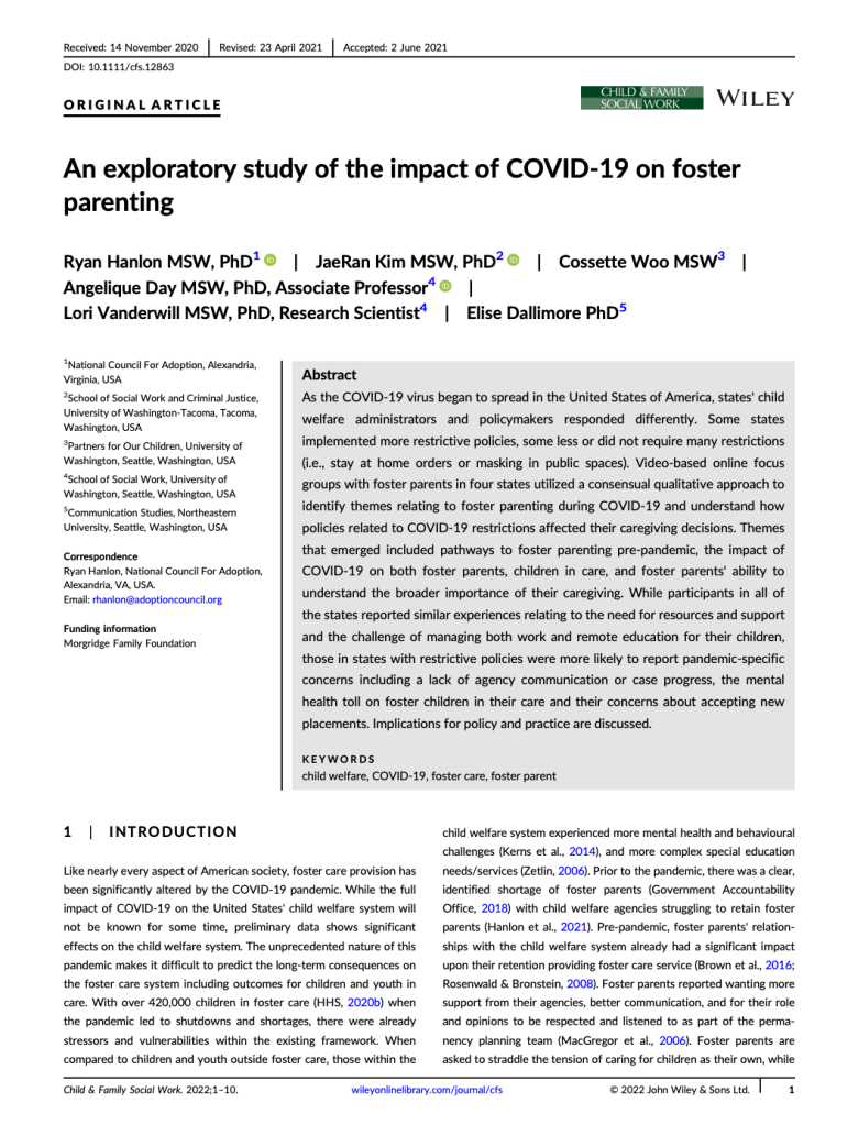Hanlon, R., Kim, J., Woo, C., Day, A., Vanderwill, L., & Dallimore, E. (2022). An exploratory study of the impact of COVID‐19 on foster parenting. Child & Family Social Work, 27(3), 371-380.