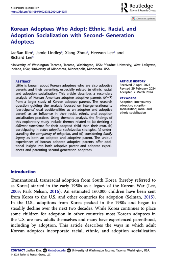 Kim, J., Lindley, J., Zhou, X., Lee, H., & Lee, R. (2024). Korean Adoptees Who Adopt: Ethnic, Racial, and Adoption Socialization with Second-Generation Adoptees. Adoption Quarterly, 1-23.