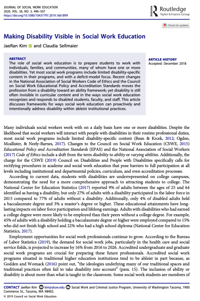 Kim, J.R. & Sellmaier, C. (2020). Making disability visible in social work education. Journal of Social Work Education. 56(3), 496-507.