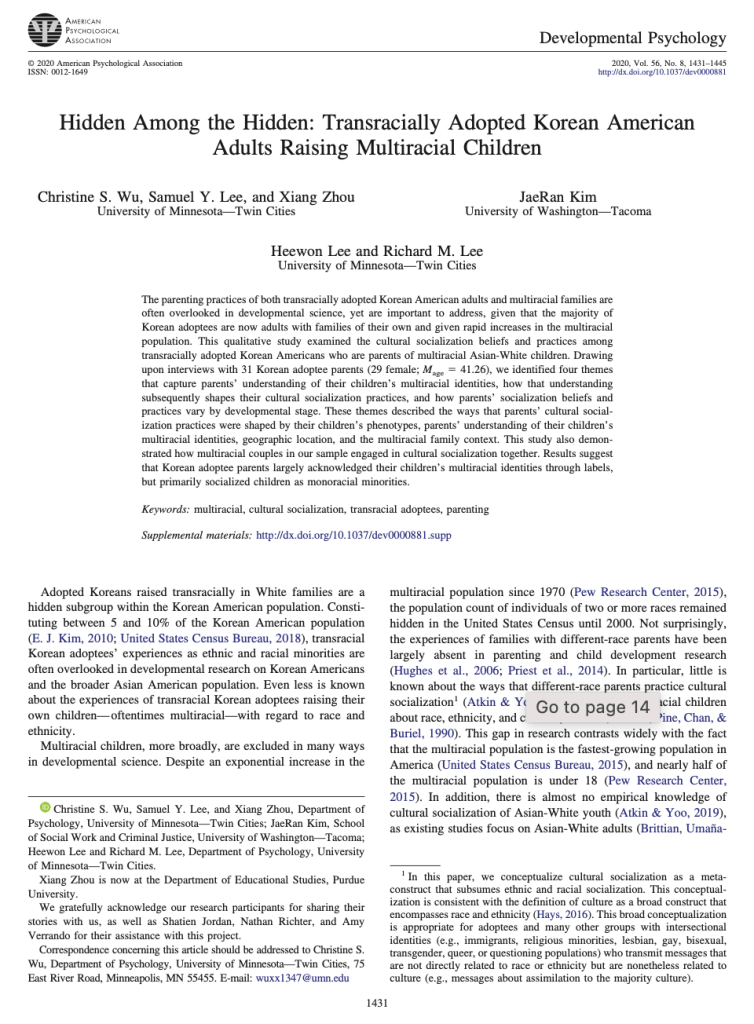 Wu, C.S., Lee, S.Y., Zhou, X.,Kim, J.R., Lee, H.W., & Lee, R.M. (2020). Hidden among the hidden: Transracially adopted Korean American adults raising multiracial children. Developmental Psychology, 56(8), 1431-1445
