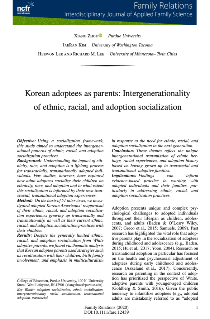 Zhou, X., Kim, J., Lee, H., & Lee, R. M. (2021). Korean adoptees as parents: Intergenerationality of ethnic, racial, and adoption socialization. Family Relations, 70(2), 637-652.
