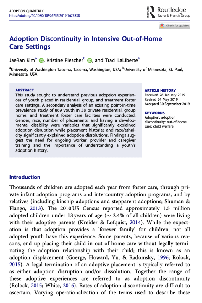 Kim, J., Piescher, K., & LaLiberte, T. (2019). Adoption discontinuity in intensive out-of-home care settings. Adoption Quarterly, 22(4), 307-329.