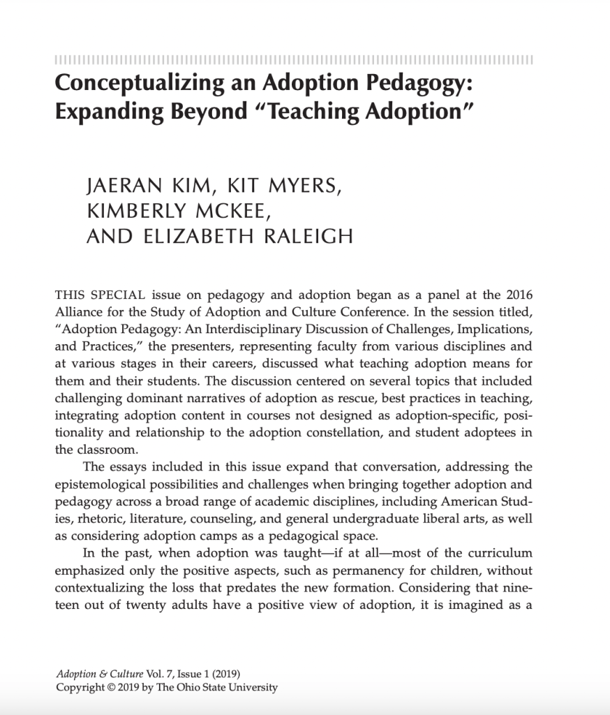 Kim, J.R., Myers, K., McKee, K. & Raleigh, E. (2019). Conceptualizing an Adoption Pedagogy: Expanding Beyond “Teaching Adoption.” Adoption & Culture, 7(1), 1-5.