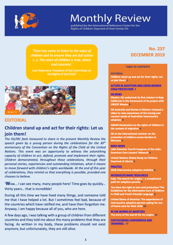 Kim, J.R. (2019). United State of America: The experiences of intercountry adoptive parents opting for out-of-home care for their child. International Reference Center for the Rights of Children Deprived of their Family – ISS Monthly Review No. 237, December 2019, 10-11.