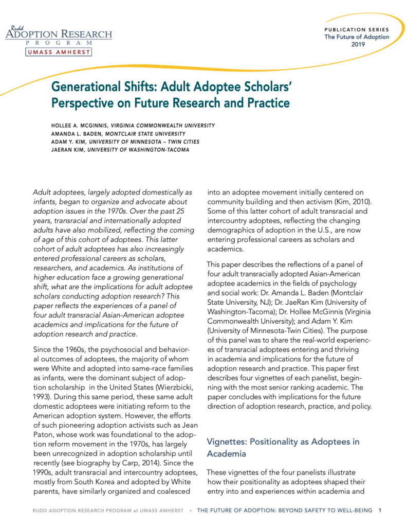 McGinnis, H.A., Baden, A.L., Kim, A.Y. & Kim, J.R. (2019). Generational shifts: Adult adoptee scholars’ perspective on future research and practice. Rudd Adoption Research Program Publication Series: The Future of Adoption. University of Massachusetts Amherst.