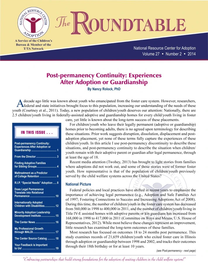 Kim, J.R. (2014). Internationally adopted children with disabilities in out of home care: Emerging research on adoptive parent perspectives. The Roundtable, 27(2).