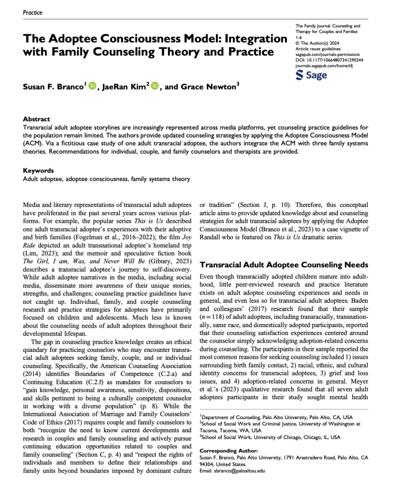 Branco, S.F., Kim, J. & Newton, G. (2024). The adoptee consciousness model: Integration with family counseling theory and practice. The Family Journal.