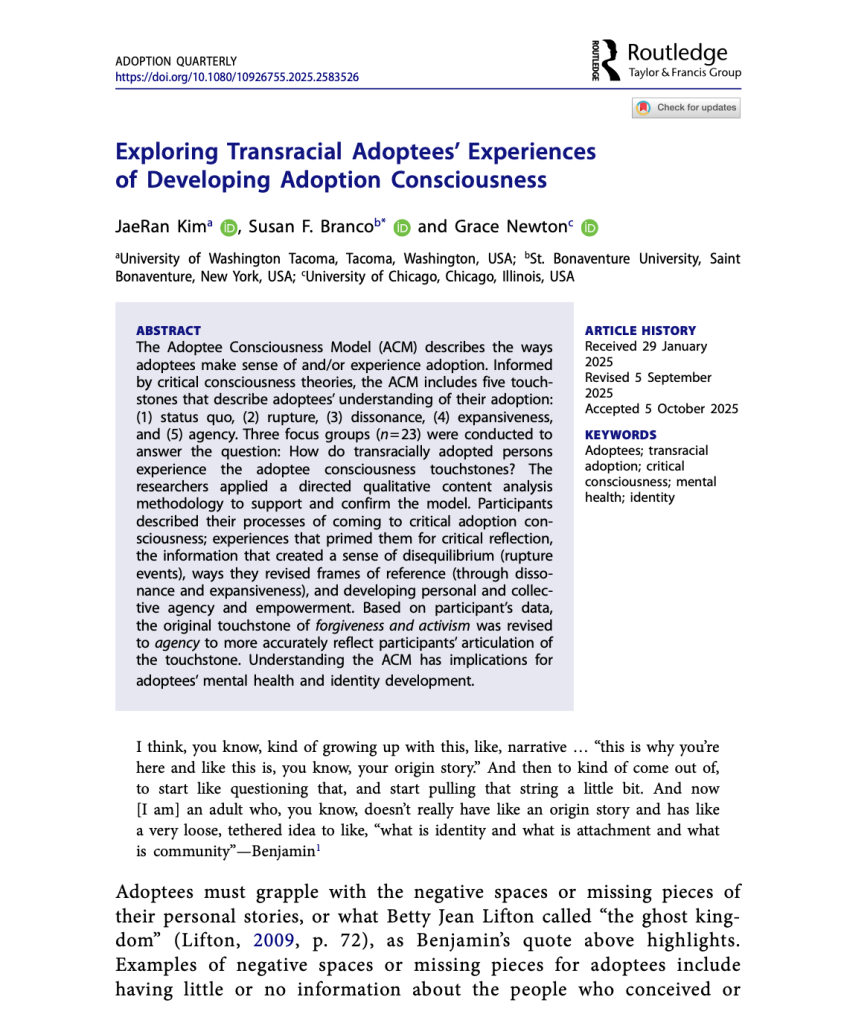 Kim, J., Branco, S.F. & Newton, G. (2025). Exploring transracial adoptees’ experiences developing adoption consciousness.Adoption Quarterly.