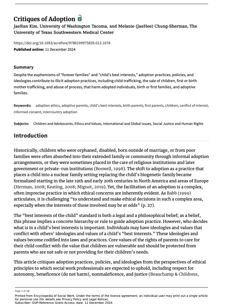 Kim, J. & Chung Sherman, M.J. (2024) Critiques of adoption. Encyclopedia of Social Work, Oxford University Press.