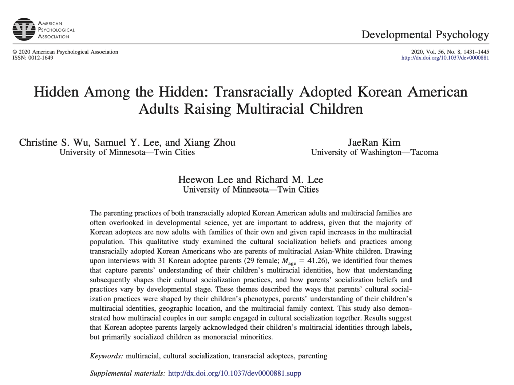 Zhou, X., Kim, J., Lee, H., & Lee, R. M. (2021). Korean adoptees as parents: Intergenerationality of ethnic, racial, and adoption socialization. Family Relations, 70(2), 637-652. DOI.org/10.1111/fare.12439